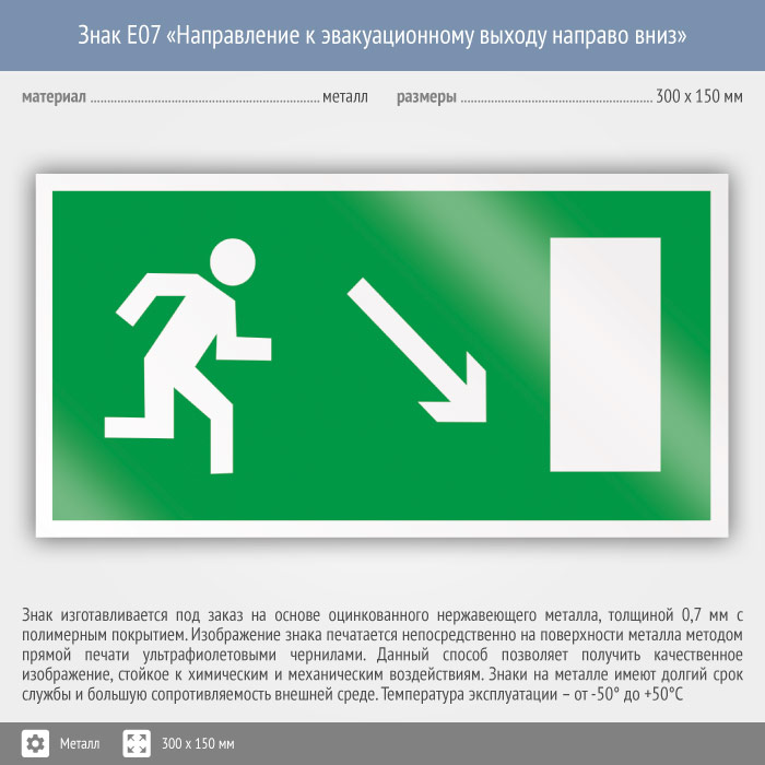 Знак E07 «Направление к эвакуационному выходу направо вниз» (металл, 300х150 мм) в Томске купить