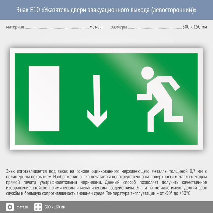 Знак E10 «Указатель двери эвакуационного выхода (левосторонний)» (металл, 300х150 мм) в Томске купить