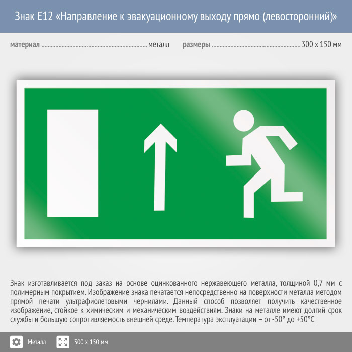 Знак E12 «Направление к эвакуационному выходу прямо (левосторонний)» (металл, 300х150 мм) в Томске купить