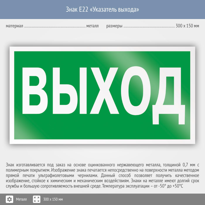Знак E22 «Указатель выхода» (металл, 300х150 мм) в Томске купить