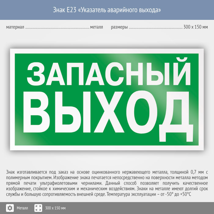 Знак E23 «Указатель запасного выхода» (устаревший) (металл, 300х150 мм) в Томске купить
