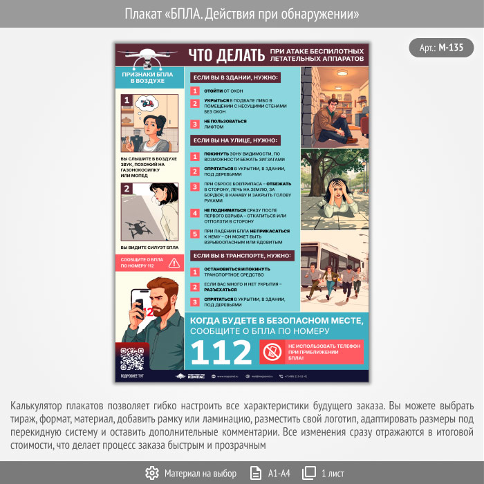 Плакат «БПЛА. Действия при обнаружении» с QR (М-135, 1 лист) в Томске купить