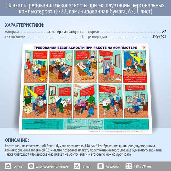 Плакат «Требования безопасности при эксплуатации персональных компьютеров» (В-22, ламинированная бумага, А2, 1 лист) в Томске купить