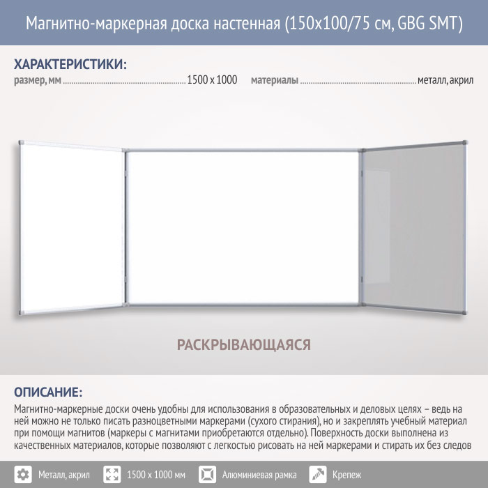 Магнитно-маркерная доска настенная (150x100/75 см, GBG SMT) в Томске купить
