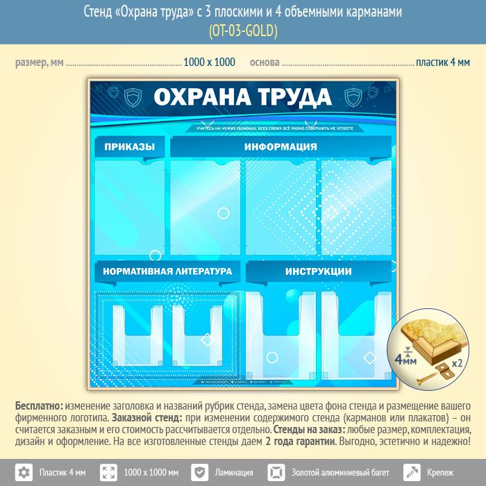 Стенд «Охрана труда» с 4 плоскими и 4 объемными карманами (OT-03-GOLD) в Томске купить