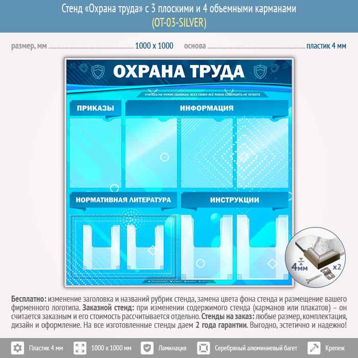 Стенд «Охрана труда» с 4 плоскими и 4 объемными карманами (OT-03-SILVER) в Томске купить