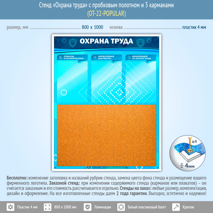 Стенд «Охрана труда» с пробковым полотном и 3 карманами (OT-22-POPULAR) в Томске купить