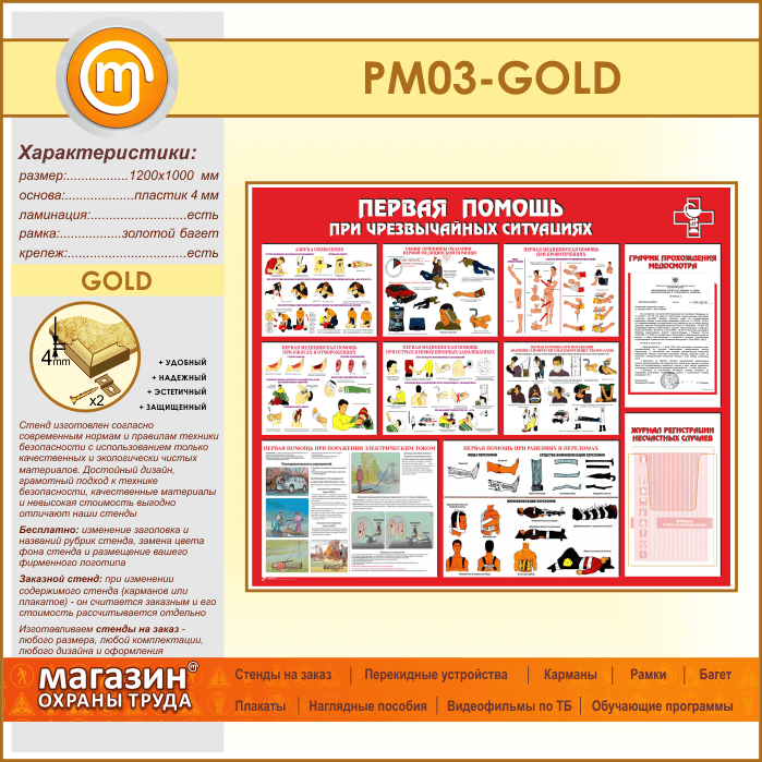Стенд «Первая помощь при чрезвычайных ситуациях» с плоским и объемным карманами (PM-03-GOLD) в Томске купить