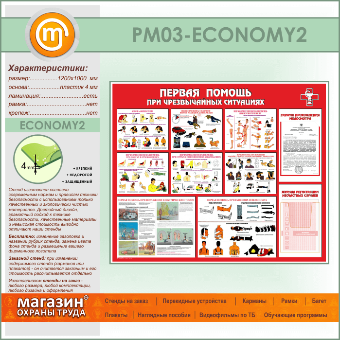 Стенд «Первая помощь при чрезвычайных ситуациях» с плоским и объемным карманами (PM-03-ECONOMY2) в Томске купить