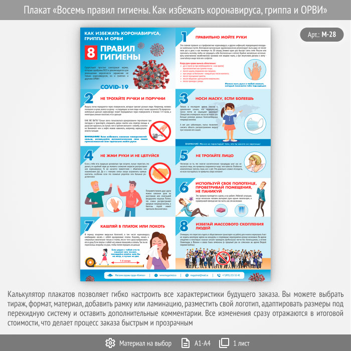 Плакат «Восемь правил гигиены. Как избежать коронавируса, гриппа и ОРВИ» может быть изготовлен любого формата и размера, на бумаге, самоклеящейся пленке, пластике, баннерной ткани и металле. Разрабатываем, рисуем и изготавливаем плакаты на любую интересующую Вас тему