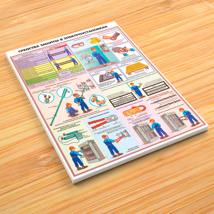 - 1 Плакат – «Основные и дополнительные средства защиты» – перчатки, галоши, коврики, подставки, изолирующие клещи и штанги, указатели электрического тока