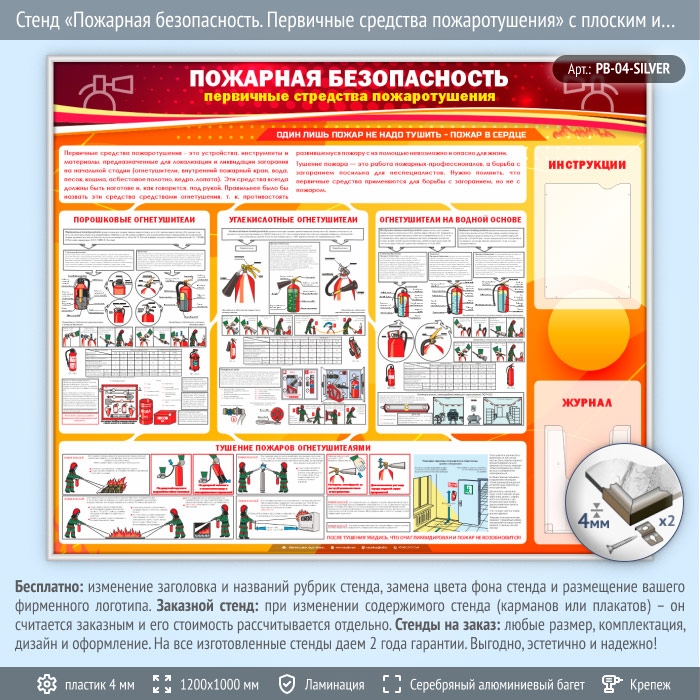 Стенд «Пожарная безопасность. Первичные средства пожаротушения» с плоским и объемным карманами (PB-04-SILVER) в Томске купить