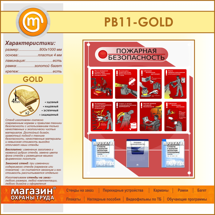 Стенд «Стенд пожарная безопасность в строительстве» с 3 объемными карманами (PB-11-GOLD) в Томске купить