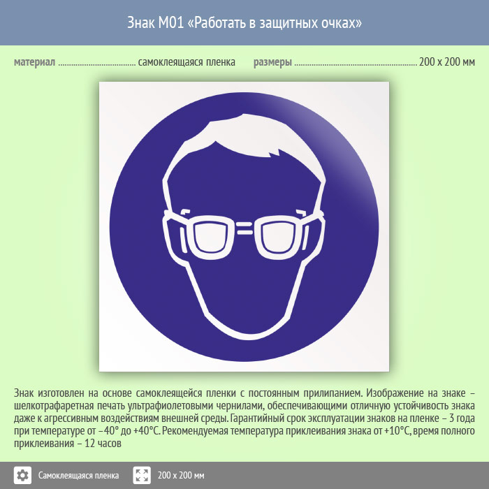 Знак M01 «Работать в защитных очках» (пленка, 200х200 мм) в Томске купить