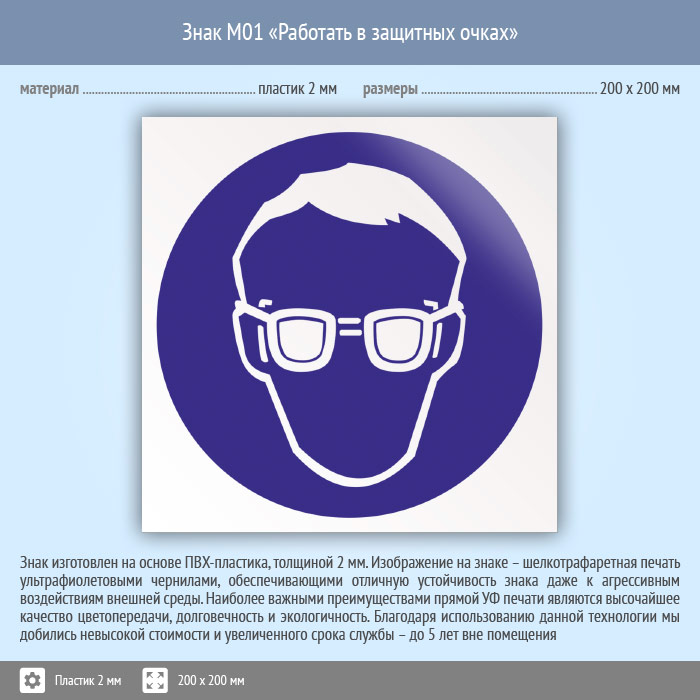 Знак M01 «Работать в защитных очках» (пластик, 200х200 мм) в Томске купить