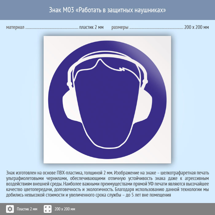 Знак M03 «Работать в защитных наушниках» (пластик, 200х200 мм) в Томске купить