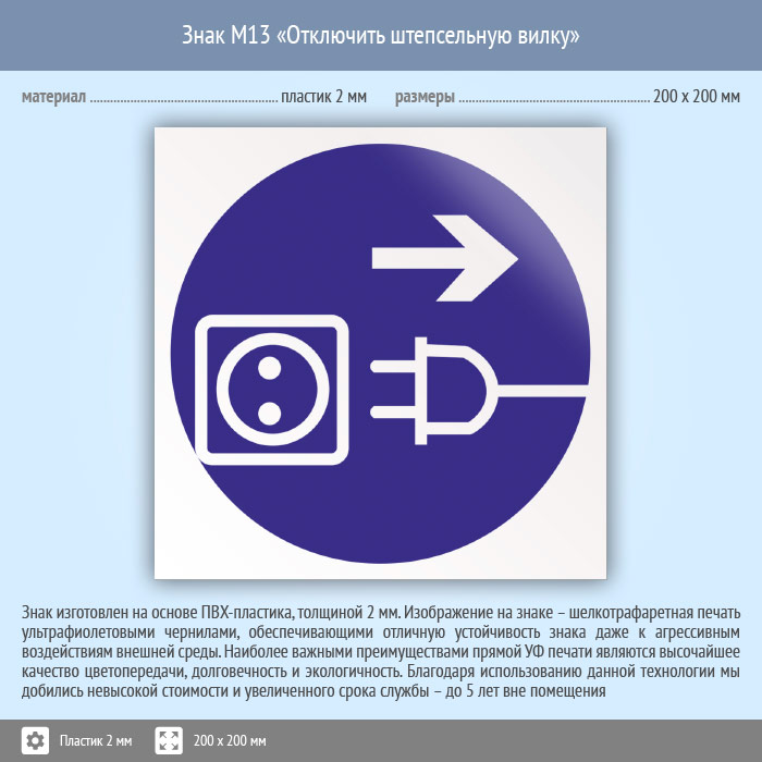 Знак M13 «Отключить штепсельную вилку» (пластик, 200х200 мм) в Томске купить