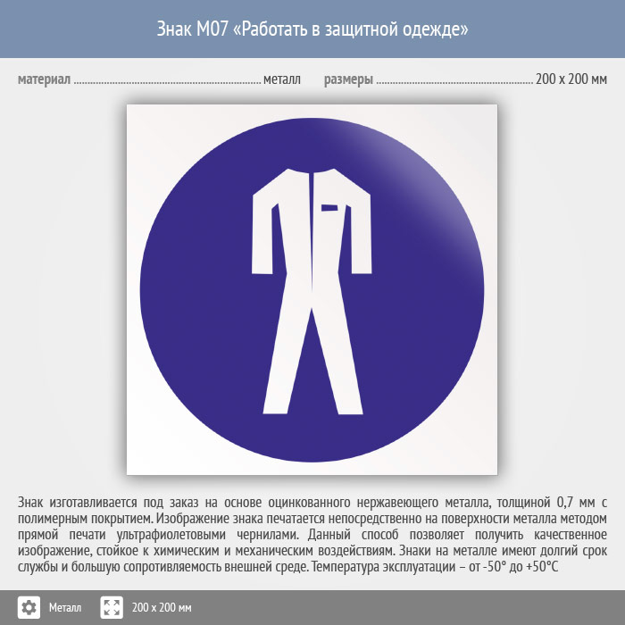Знак M07 «Работать в защитной одежде» (металл, 200х200 мм) в Томске купить