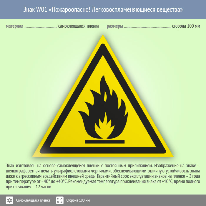 Знак W01 «Пожароопасно! легковоспламеняющиеся вещества» (пленка, сторона 100 мм) в Томске купить