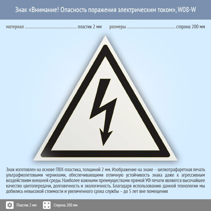 Знак W08-W «Внимание! опасность поражения электрическим током» (белый, пластик, сторона 200 мм) в Томске купить
