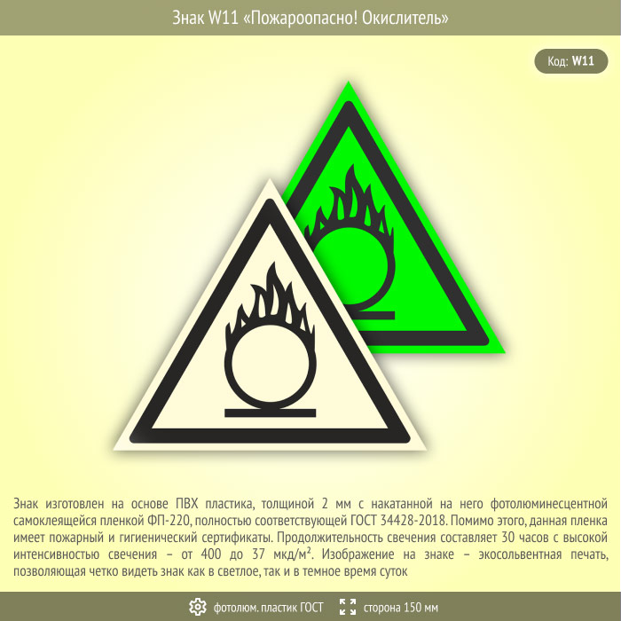Знак W11 «Пожароопасно! Окислитель» (фотолюминесцентный пластик ГОСТ 34428-2018, сторона 150 мм) в Томске купить