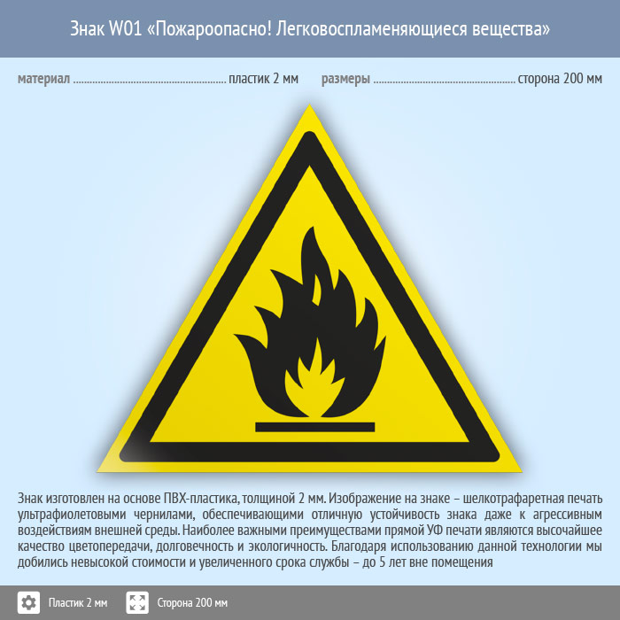 Знак W01 «Пожароопасно! легковоспламеняющиеся вещества» (пластик, сторона 200 мм) в Томске купить