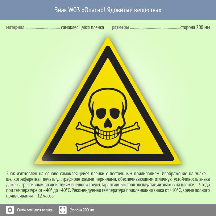 Знак W03 «Опасно! ядовитые вещества» (пленка, сторона 200 мм) в Томске купить
