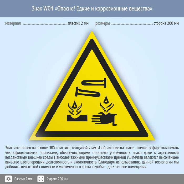 Знак W04 «Опасно! едкие и коррозионные вещества» (пластик, сторона 200 мм) в Томске купить