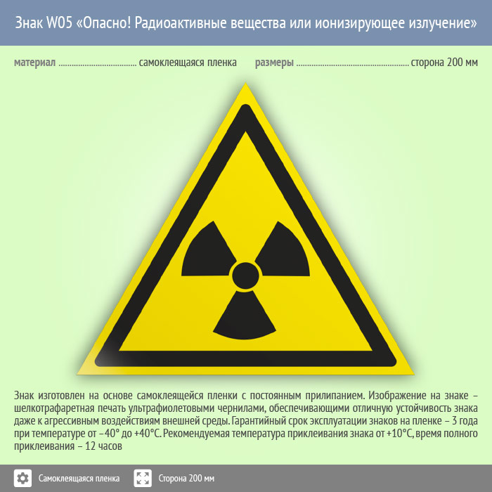 Знак W05 «Опасно! радиоактивные вещества или ионизирующее излучение» (пленка, сторона 200 мм) в Томске купить