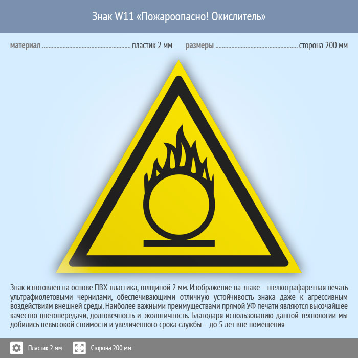 Знак W11 «Пожароопасно! окислитель» (пластик, сторона 200 мм) в Томске купить
