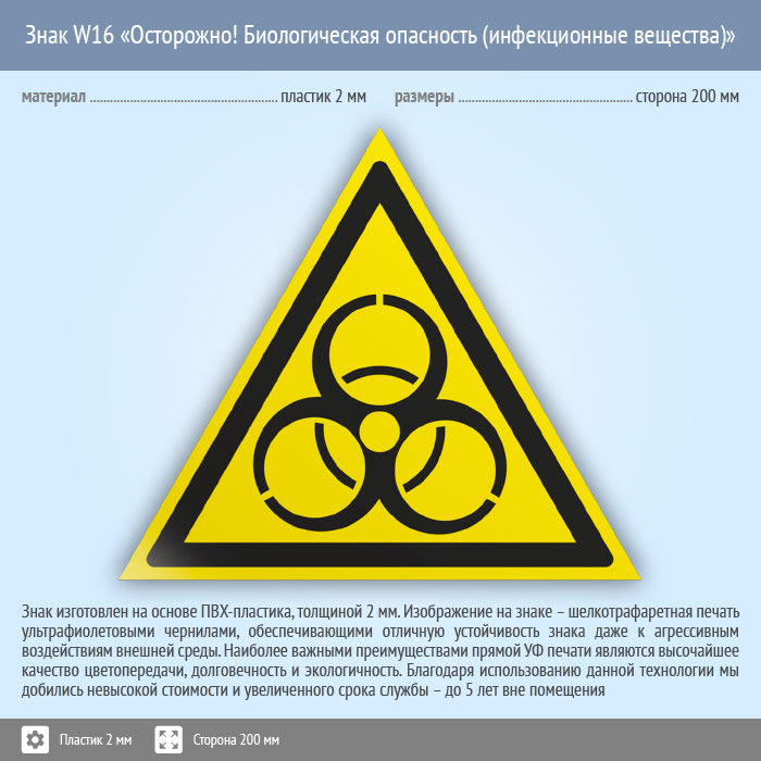 Знак W16 «Осторожно! биологическая опасность (инфекционные вещества)» (пластик, сторона 200 мм) в Томске купить