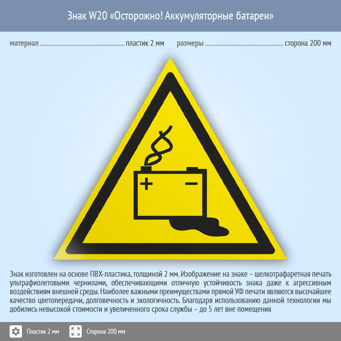 Знак W20 «Осторожно! аккумуляторные батареи» (пластик, сторона 200 мм) в Томске купить