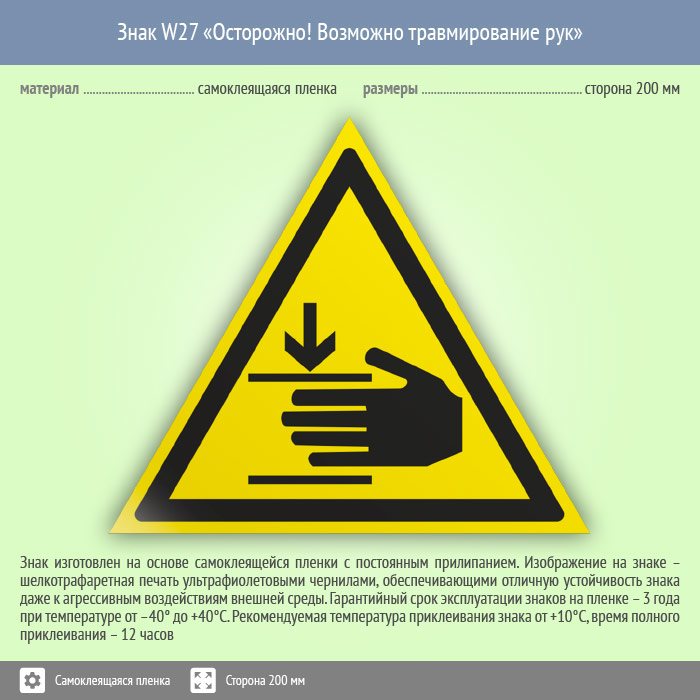 Знак W27 «Осторожно! возможно травмирование рук» (пленка, сторона 200 мм) в Томске купить
