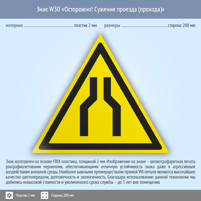 Знак W30 «Осторожно! сужение проезда (прохода)» (пластик, сторона 200 мм) в Томске купить
