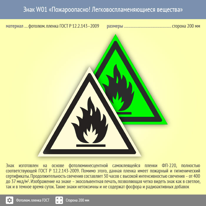 Знак W01 «Пожароопасно! легковоспламеняющиеся вещества» (фотолюминесцентная пленка ГОСТ 34428-2018, сторона 200 мм) в Томске купить
