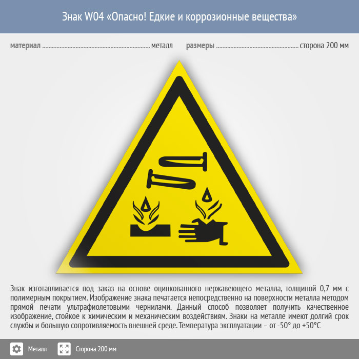 Знак W04 «Опасно! едкие и коррозионные вещества» (металл, сторона 200 мм) в Томске купить