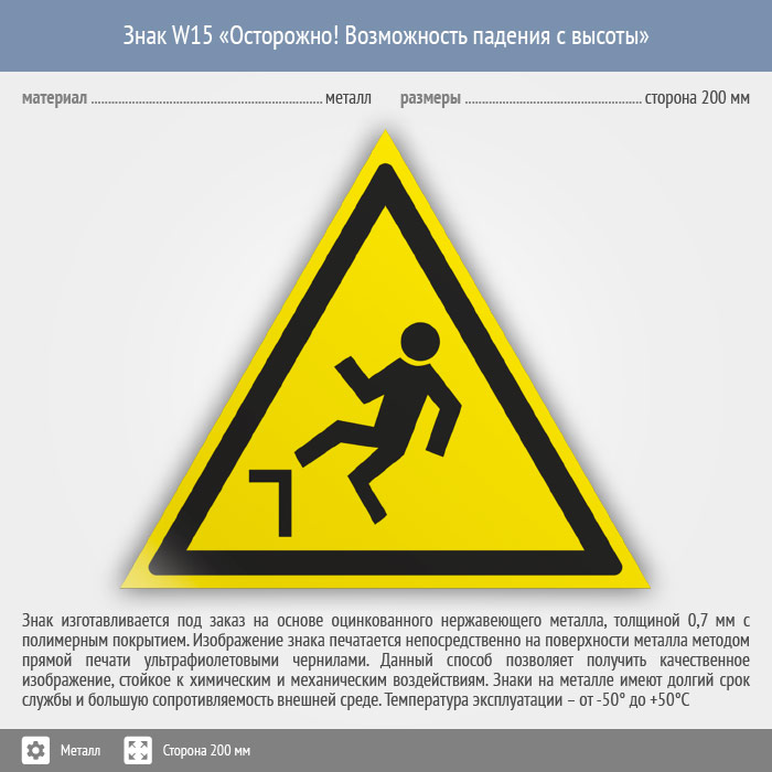 Знак W15 «Осторожно! возможность падения с высоты» (металл, сторона 200 мм) в Томске купить