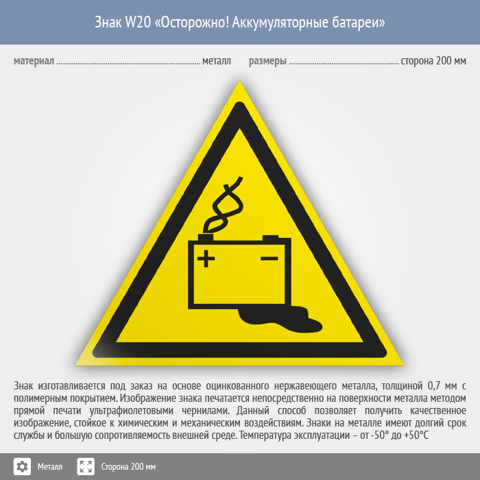 Знак W20 «Осторожно! аккумуляторные батареи» (металл, сторона 200 мм) в Томске купить