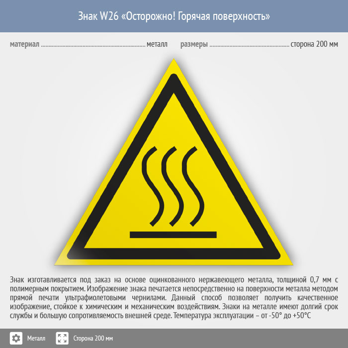 Знак W26 «Осторожно! горячая поверхность» (металл, сторона 200 мм) в Томске купить