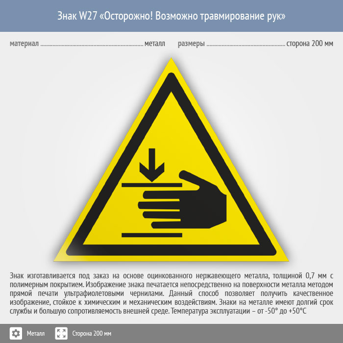 Знак W27 «Осторожно! возможно травмирование рук» (металл, сторона 200 мм) в Томске купить