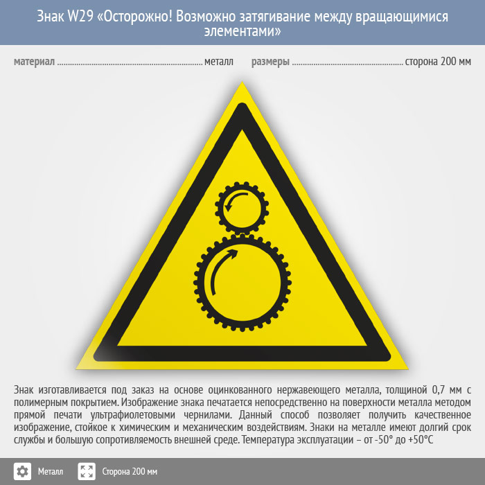 Знак W29 «Осторожно! возможно затягивание между вращающимися элементами» (металл, сторона 200 мм) в Томске купить