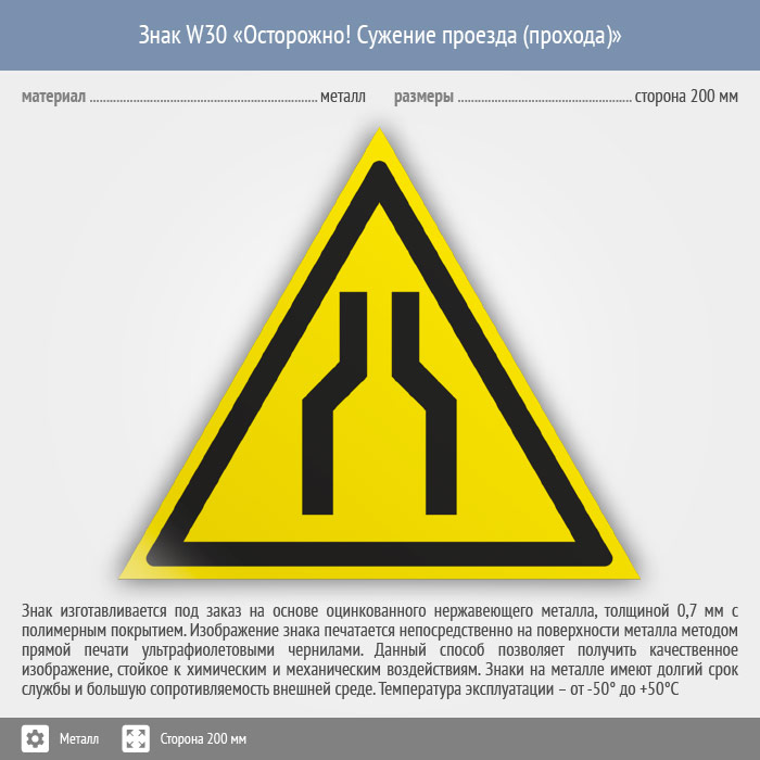 Знак W30 «Осторожно! сужение проезда (прохода)» (металл, сторона 200 мм) в Томске купить