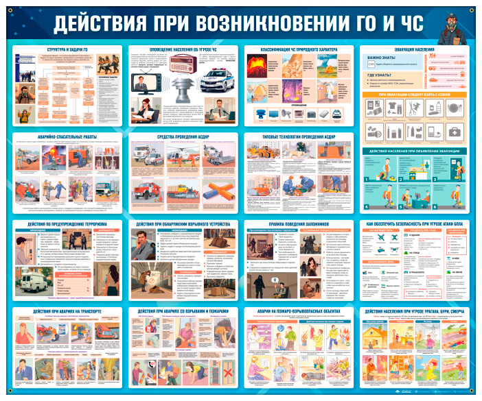 Стенд «Действия при возникновении ГО и ЧС» (GO-46) содержит наглядную информацию о действиях населения при угрозе и возникновении чрезвычайных ситуаций природного, техногенного и социального характера: порядок оповещения и эвакуации, поведение при авариях, взрывах, пожарах, террористической угрозе и применении оружия массового поражения. Представлены схемы гражданской обороны, типовые спасательные работы, правила при обнаружении взрывных устройств и подозрительных предметов, а также меры по обеспечению безопасности и оказанию первой помощи пострадавшим.