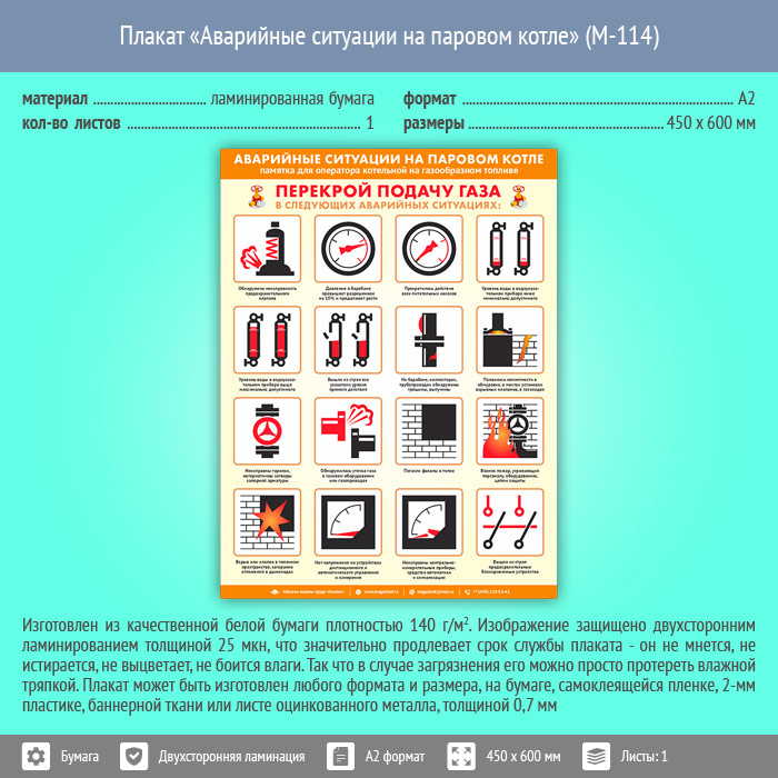 Плакат «Аварийные ситуации на паровом котле» (М-114, ламинированная бумага, А2, 1 лист) в Томске купить