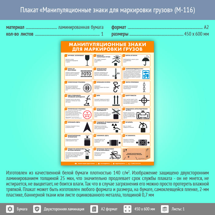 Плакат «Манипуляционные знаки для маркировки грузов» (М-116, ламинированная бумага, А2, 1 лист) в Томске купить