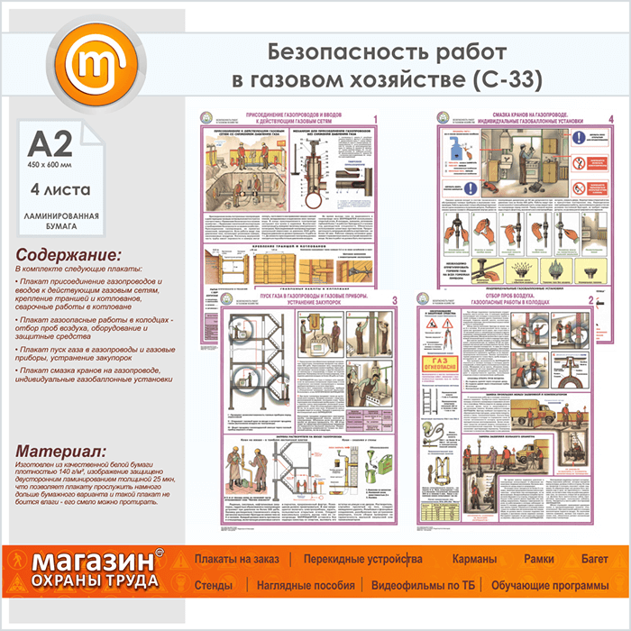 Плакаты «Безопасность работ в газовом хозяйстве» (С-33, ламинированная бумага, А2, 4 листа) в Томске купить