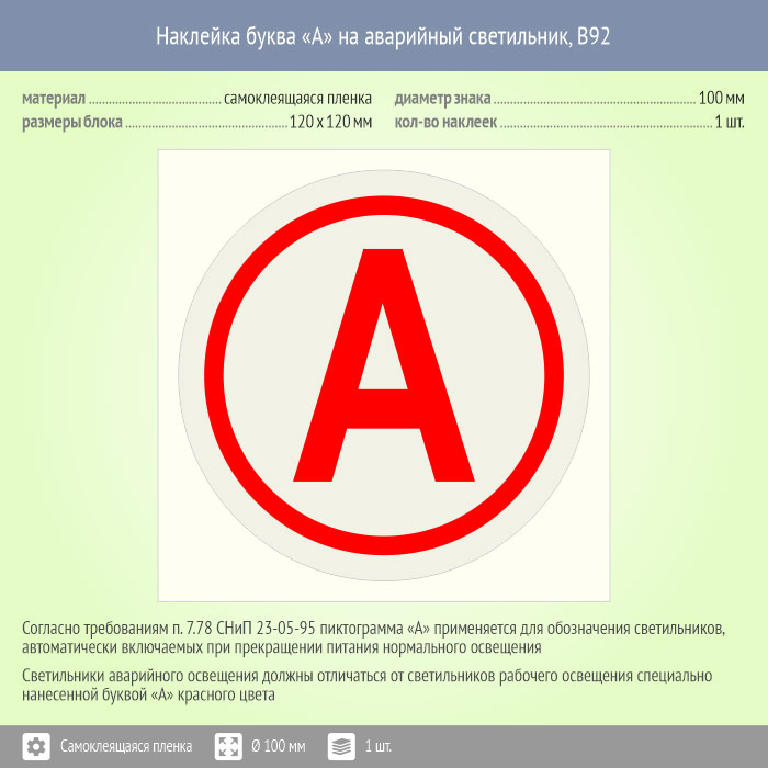 Наклейка буква «А» на аварийный светильник, B92 (пленка, диаметр 100 мм, 120х120 мм) в Томске купить