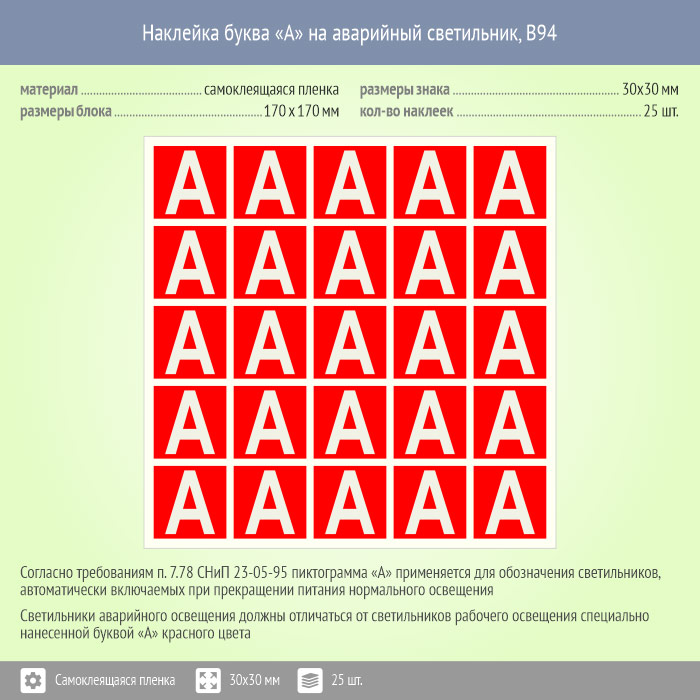 Наклейка буква «А» на аварийный светильник, B94 (пленка, 30х30 мм, блок 25 штук, 170х170 мм) в Томске купить