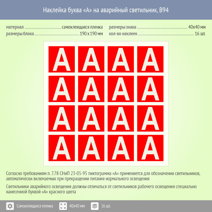 Наклейка буква «А» на аварийный светильник, B94 (пленка, 40х40 мм, блок 16 штук, 190х190 мм) в Томске купить