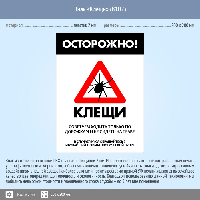 Знак «Осторожно! Клещи», B102 (пластик, 400х600 мм) в Томске купить